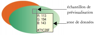 Dans la fenêtre d’image, un témoin de prévisualisation est joint à l’outil Pipette, ainsi qu’une zone de données répertoriant les valeurs des modèles colorimétriques. Lorsque vous échantillonnez une couleur RVB, la zone de données répertorie également la valeur hexadécimale de la couleur.