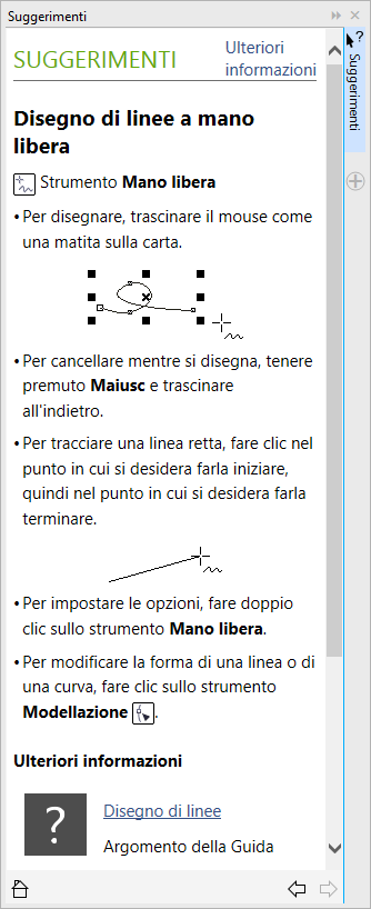 La finestra mobile Suggerimenti è un centro di preziose risorse di apprendimento progettate per ridurre la curva di apprendimento per i nuovi utenti. Visualizza dinamicamente informazioni sensibili al contesto sullo strumento attualmente selezionato e fornisce collegamenti e informazioni correlate. La finestra mobile Suggerimenti fornisce accesso rapido a risorse aggiuntive, ad esempio suggerimenti video, video più lunghi ed esercitazioni scritte, per ottenere maggiori informazioni su uno strumento o una funzione senza eseguire ricerche. Per ulteriori informazioni, consultare Uso dei suggerimenti.