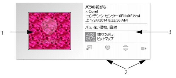 塗りつぶしやパターンのプレビュー (1)、評価、コピー、その他のオプションの指定 (2)、キーワード検索 (3) が可能