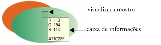 Na janela da imagem, uma visualização da amostra de cores é anexada à ferramenta Conta-gotas juntamente com uma caixa de informações que lista os valores dos componentes do modelo de cores. Ao obter uma amostra de uma cor RGB, a caixa de informações também inclui o valor hexadecimal da cor.