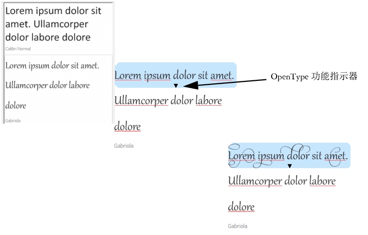对于使用 OpenType 字体的文本示例,您可以选择文本来显示 OpenType 功能指示器并应用 OpenType 功能。在本示例中,一个样式集应用到了所选文本中。