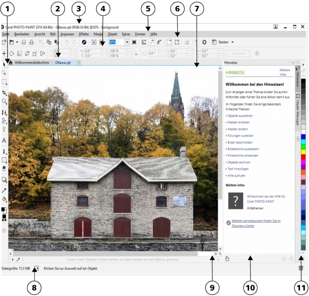 Fenster, über das Sie auf zusätzliche Befehle und Bildinformationen zugreifen können. Einige Andockfenster enthalten einen Vorschaubereich. Die Andockfenster Hinweise und Objekt-Manager sind standardmäßig geöffnet.