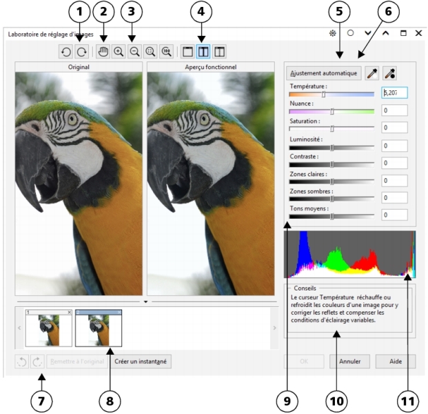 Cliquez sur le bouton Créer un instantané pour capturer la version actuelle de l’image. Les miniatures des instantanés apparaissent dans une fenêtre située sous l’image. Chaque instantané est numéroté séquentiellement. Pour supprimer un instantané, il suffit de cliquer sur le bouton de fermeture situé dans l’angle supérieur droit de sa barre de titre.