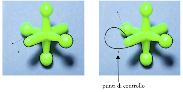 È possibile creare un tracciato Bézier posizionando nodi su un'immagine. I nodi sono uniti da segmenti di linea retti o curvi. I punti di controllo indicano la direzione del segmento curvo e il relativo angolo rispetto al nodo. Una volta disegnato il tracciato, è possibile apportare modifiche per ottenere una forma più precisa. Per ulteriori informazioni sulla modellazione dei tracciati, consultare Modellazione di tracciati.