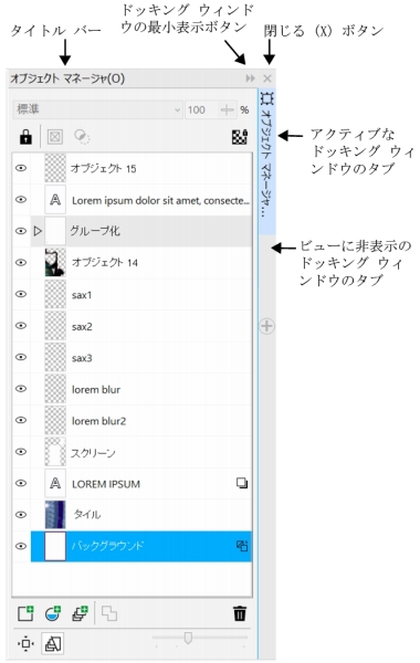 ドッキング ウィンドウの例として、[オブジェクト マネージャ] ドッキング ウィンドウがあります。[オブジェクト マネージャ] ドッキング ウィンドウには、オブジェクトに関するコマンド ボタンとオプションに加え、イメージのバックグラウンドとオブジェクト レイヤごとにサムネールが表示されます。