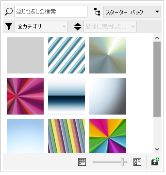 塗りつぶしや透明がサムネール イメージとして表示されます。サムネールの上にポインタを移動すると、ファイルの名前や場所を表示できます。サムネールのサイズを調整して、塗りつぶしや透明のプレビューをより速く簡単にできます。また、[塗りつぶし] ピッカーや [透明度] ピッカーのサイズを変更して、一度に表示されるサムネールの数を増やすこともできます。