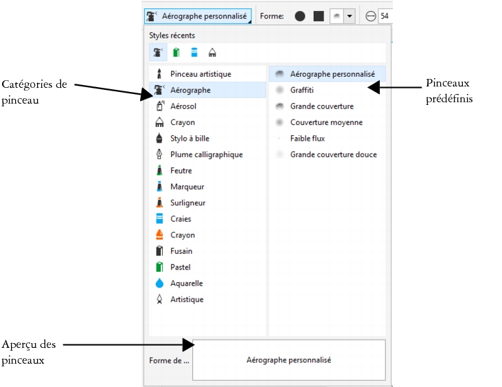 Le sélecteur Pinceau permet d’afficher l’aperçu des pinceaux prédéfinis qui sont classés par catégorie et de les sélectionner.