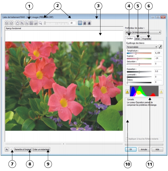 Lorsqu’un ou plusieurs fichiers bruts d’appareil photo sont ouverts dans Corel PHOTO-PAINT, ils s’affichent avant tout dans le Labo de traitement RAW. Les commandes du Labo de traitement RAW permettent d’ajuster la couleur et le ton des images brutes d’appareil photo. Si les ajustements d’un fichier vous conviennent, vous pouvez apporter les mêmes ajustements aux fichiers restants.