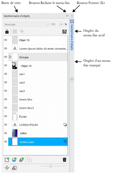 Prenons l’exemple du menu fixe Gestionnaire d’objets. Le menu fixe Gestionnaire d’objets affiche des miniatures de l’arrière-plan de l’image et de chaque plan d’objet, ainsi que des options et boutons de commande liés aux objets.