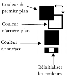 Le témoin Couleur de premier plan indique la couleur de premier plan actuelle appliquée à tous les outils Peinture et au texte. Le témoin Couleur d’arrière-plan indique la couleur d’arrière-plan actuelle qui apparaît lorsque vous effacez une partie de l’arrière-plan ou augmentez le format du papier. La flèche permet de permuter la couleur de premier plan et d’arrière-plan. Le témoin Couleur de surface indique la couleur de surface actuelle appliquée aux outils Forme et Surface. L’icône Réinitialiser les couleurs permet de rétablir les couleurs par défaut : noir pour les couleurs de premier plan et de surface et blanc pour la couleur d’arrière-plan. |