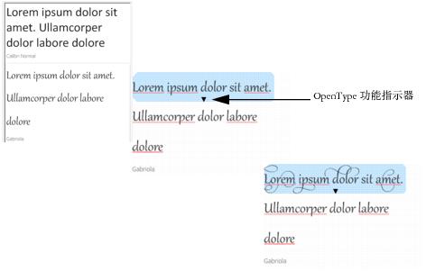 当文本示例使用 OpenType 字体时,您可以查看可用的 OpenType 功能并将它们应用到文本示例中。