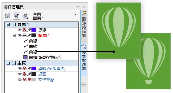 物件隱藏後,物件名稱會以灰色顯示在「物件管理員」泊塢視窗中,圖示則會顯示在名稱旁邊。