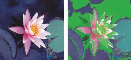 左上圖:RGB 色彩描述檔已指定給文件。中間圖和右圖:指定特定的 CMYK 描述檔可在螢幕上模擬列印輸出。