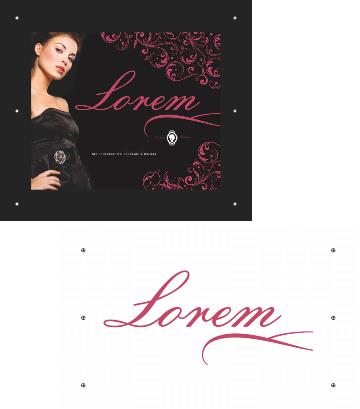 Nahoře: Značky průchodek a hnědé okraje jsou přidány do celého designu. Dole: Do nápisu jsou zahrnuty pouze vybrané objekty a přidávají se okraje a značky průchodek.