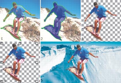 Opérations du Laboratoire de détourage : (1) Surlignez les bords de la zone d’image. (2) Ajoutez une surface à l’intérieur de la zone. (3) Prévisualisez la découpe et retouchez-la si nécessaire. (4) Importez la découpe dans la fenêtre d’image. (5, facultatif) Placez la découpe sur une image d’arrière-plan.
