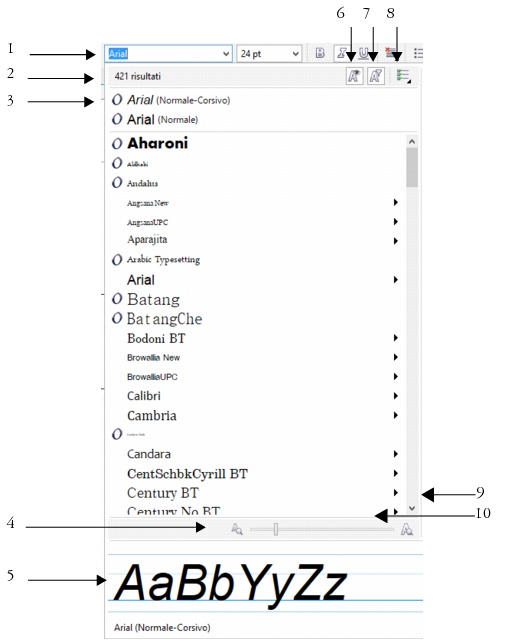 | • | Ridimensionamento dell'area dell'elenco dei caratteri |