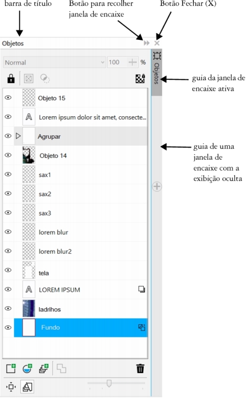 Um exemplo é a janela de encaixe Gerenciador de objetos. A janela de encaixe Gerenciador de objetos exibe miniaturas do fundo da imagem e de cada camada do objeto, além de botões de comando e opções relacionadas a objetos.