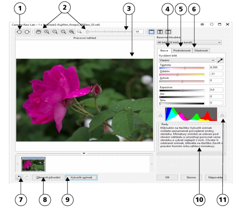 | 3 . | V nástroji Camera RAW Lab upravte barvy a tóny obrázku RAW. V případě potřeby můžete obrázek také doostřit nebo snížit úroveň šumu. |