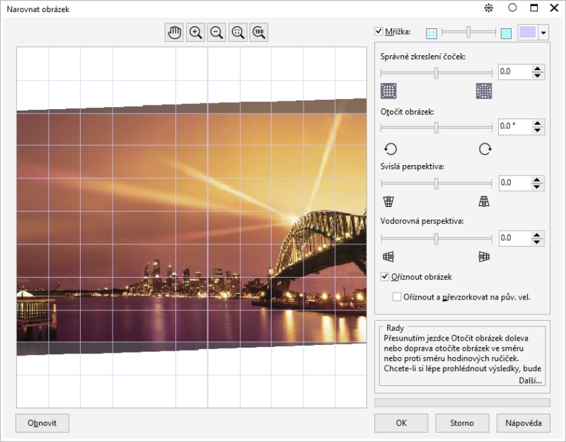 V dialogovém okně Narovnat obrázek můžete rychle provést korekci zkreslení objektivu a narovnat rastrové obrázky. Tato funkce je užitečná pro narovnávání fotografií, které byly pořízeny nebo naskenovány pod určitým úhlem nebo obsahují zkreslení objektivu.