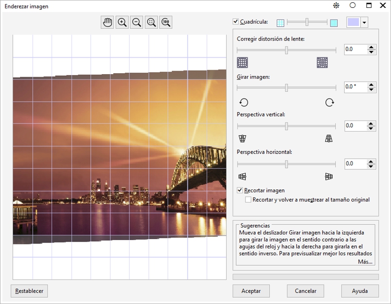 El cuadro de diálogo Enderezar imagen permite enderezar imágenes de mapa de bits rápidamente. Esta función resulta útil para enderezar fotos escaneadas, tomadas torcidas o que contengan distorsiones de lentes.