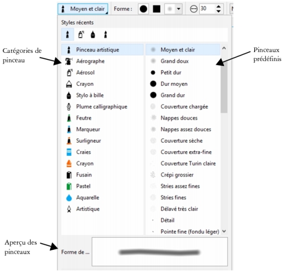 Le sélecteur Pinceau permet d’afficher l’aperçu des pinceaux prédéfinis qui sont classés par catégorie et de les sélectionner.