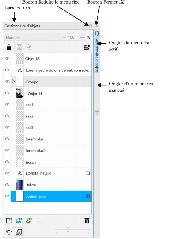 Prenons l’exemple du menu fixe Gestionnaire d’objets. Le menu fixe Gestionnaire d’objets affiche des miniatures de l’arrière-plan de l’image et de chaque plan d’objet, ainsi que des options et boutons de commande liés aux objets.