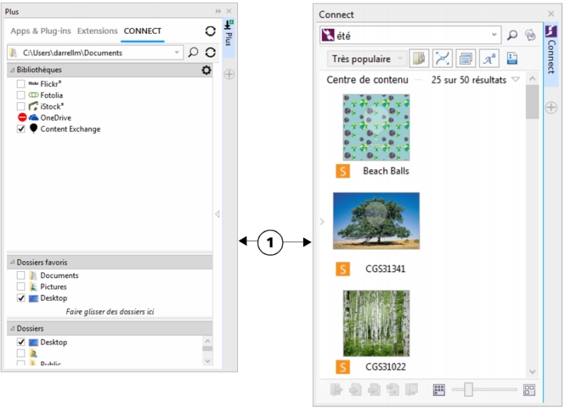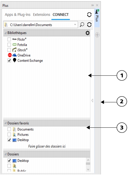 La page CONNECT du menu fixe Plus présente deux modes d’affichage : volet unique et affichage intégral. En mode d’affichage intégral, tous les volets sont affichés. En mode de volet unique, seul le volet d’affichage, le volet Bibliothèques, le volet Dossiers favoris ou le volet Dossiers est affiché. Vous pouvez redimensionner le menu fixe pour afficher tous les volets, ou basculer entre le volet d’affichage et les volets Bibliothèques, Dossiers favoris et Dossiers.