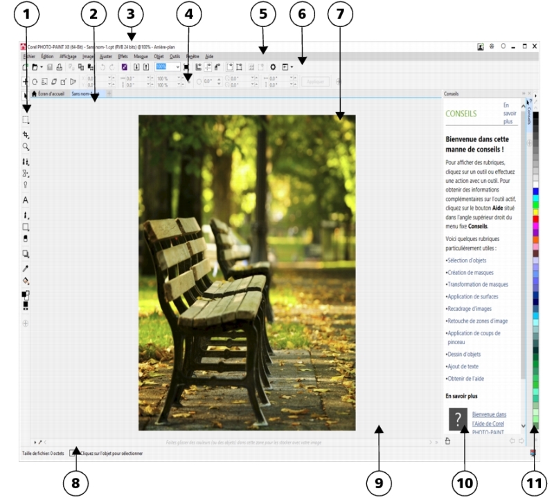Il est possible de personnaliser de nombreux éléments de la fenêtre d’application afin de les adapter à vos habitudes de travail. Pour plus d’informations sur la personnalisation de Corel PHOTO-PAINT, reportez-vous à la section Personnalisation de.