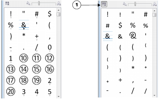 左圖:各別字元下方的 Open Type 功能指示器會顯示有更多字符可供使用。右圖:按下「顯示所有字符」按鈕 (1) 後,即可快速檢視所有可用的字符。