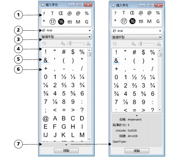 不支援 OpenType 功能的字型無法使用「顯示所有字符」按鈕。 |