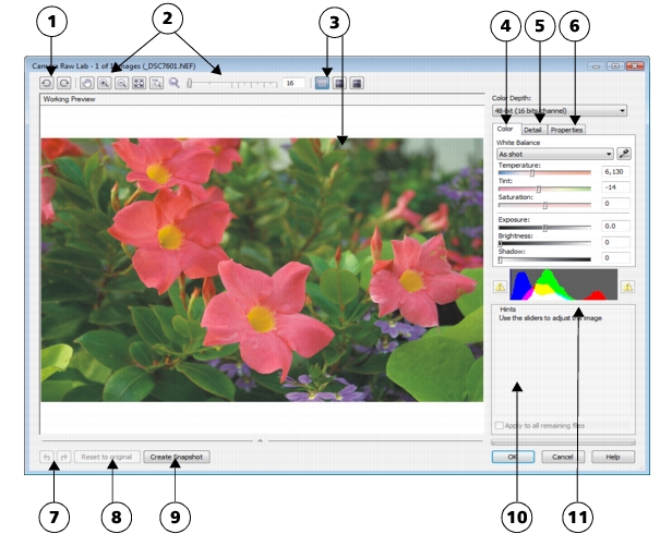 Camera RAW Lab: circled numbers correspond to the numbers in the following table, which describes the main components of the lab.