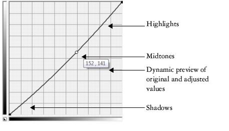 The tone curve shows the balance between the shadows, midtones, and highlights of an image. The original (x) and adjusted (y) pixel values are displayed side by side when you drag the tone curve. This example shows a small adjustment to the tonal range, in which pixel values of 152 are replaced with pixel values of 141.