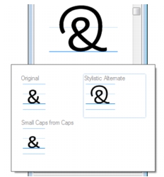 La ventana acoplable Insertar carácter resulta ideal para ver y aplicar las funciones OpenType que ofrecen las fuentes homónimas. La vista predeterminada muestra una lista en la que aparecen agrupados los glifos de los distintos caracteres. Si lo prefiere, también puede cambiar a una lista de mayor extensión en la que se vean de una sola vez los glifos disponibles.