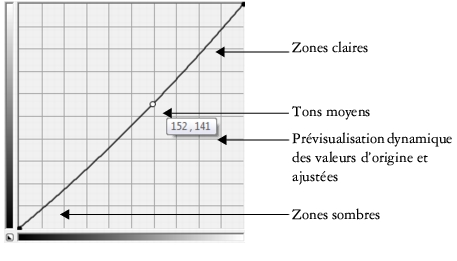 La courbe de teinte représente l’équilibre entre les zones sombres, les tons moyens et les zones claires d’une image. Les valeurs de pixels d’origine (x) et ajustées (y) sont affichées côte à côte lorsque vous faites glisser la courbe de teinte. Cet exemple montre un petit ajustement à la plage des tons, dans laquelle les valeurs de pixels de 152 sont remplacées par des valeurs de pixels de 141.