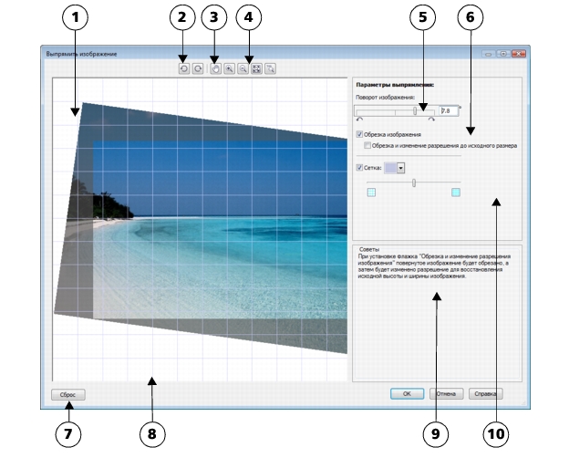 В окне предварительного просмотра отображаются результаты применяемых настроек. Если требуется изменить ориентацию изображения до его выпрямления, можно начать с поворота изображения на 90° по часовой или против часовой стрелки.