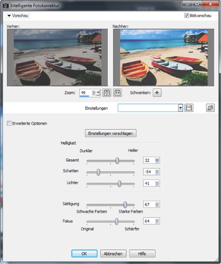 | Das Dialogfeld Intelligente Fotokorrektur wird geöffnet. Im oberen Teil des Dialogfelds wird im Fenster Vorher das Originalfoto dargestellt. Das Fenster Nachher zeigt die Darstellung nach Anwendung der gewählten grundlegenden Korrekturen. |