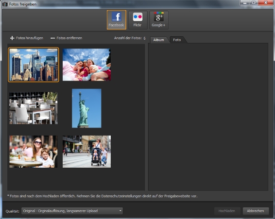 Wenn Sie über eine aktive Internetverbindung verfügen, können Sie Ihre Fotos direkt aus der Anwendung auf Sharing-Websites wie Facebook, Flickr und Google+ hochladen.