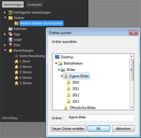 Zum Importieren von Fotos in Corel PaintShop Pro müssen Sie lediglich die Anwendung im Arbeitsbereich Verwalten öffnen und zu einem Fotoordner auf Ihrem Computer navigieren. Die Anwendung katalogisiert automatisch die Ordner, zu denen Sie navigieren, und "importiert" sie in die Anwendung, ohne dabei Dateien zu duplizieren.