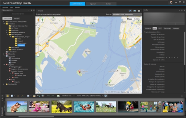 Paleta Navegación: Las fotos etiquetadas se organizan por ubicación en la carpeta Lugares según el orden jerárquico de paìs, provincia o región, ciudad y calle. Las fotos con información de una ubicación que no se encuentre en el mapa se incluirán en la carpeta Lugares desconocidos. Puede etiquetar estas fotos de forma manual, o bien importando los datos de ubicación y estableciendo una correspondencia entre ellos y las fotos. Después de que se etiqueten las fotos, estas se moverán a la carpeta adecuada en virtud de su ubicación.