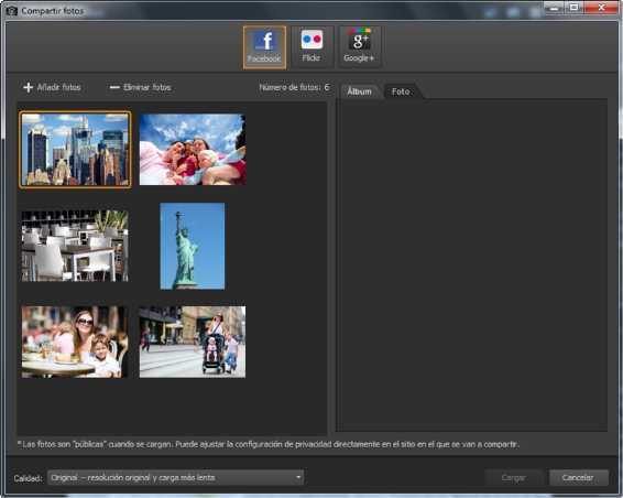 Puede cargar sus fotos en sitios de compartición, como Facebook, Flickr y Google+, directamente desde la aplicación cuando se conecte a Internet.