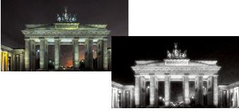 Originele foto (links) en dezelfde foto waarop het effect Infrarode film is toegepast (rechts)
