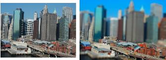 Een stadscène (links) lijkt op die manier omgezet te worden naar een miniatuurmodel (rechts).