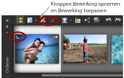 Nadat u een foto hebt bewerkt in het werkvlak Aanpassen of Bewerken, verschijnt een klein bewerkingspictogram op het miniatuur van de foto. Als u terugkeert naar het werkvlak Beheren, hebt u toegang tot de opdrachten Bewerking opnemen en Bewerking toepassen, om de wijzigingen toe te passen op andere foto's.