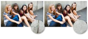 Het gereedschap Kloonpenseel is gebruikt om de scheuren in de muur op de foto links te verwijderen.