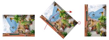 Afbeeldingen kunnen ook naar een willekeurige hoek worden geroteerd door een rotatiegraad op te geven of deze interactief op het doek te roteren. Zie Afbeeldingen rechttrekken voor meer informatie over het roteren van een afbeelding om deze recht te trekken met behulp van referentiepunten in de afbeelding, zoals de horizon.