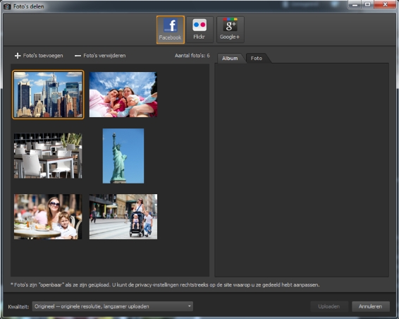U kunt uw foto's direct vanuit het programma uploaden naar uitwisselingssites zoals Facebook, Flickr en Google+ als u bent aangesloten op het internet.