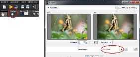 Links ziet u de knop voor de vervolgkeuzelijst Voorinstellingen van het gereedschap Pannen in het palet Gereedschapsopties, en rechts ziet u de knop voor de vervolgkeuzelijst Voorinstellingen in het dialoogvenster van het effect Houtskool.