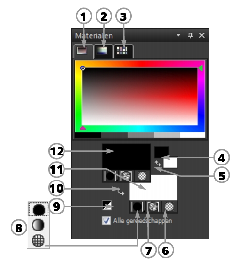 Alle gereedschappen — dit selectievakje geeft aan of het geselecteerde voorgrond- en achtergrondmateriaal van toepassing is op alle gereedschappen. Als dit selectievakje niet gemarkeerd is, worden de geselecteerde materialen alleen op het actieve gereedschap toegepast. |