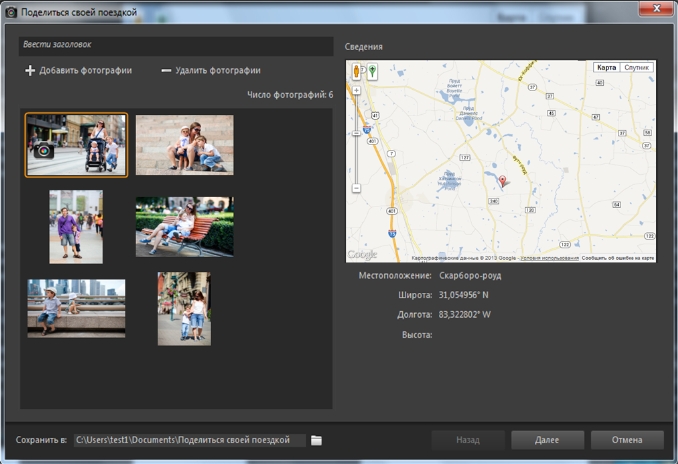 В диалоговом окне «Поделиться своей поездкой» можно добавить заголовок для слайд-шоу, посмотреть сведения о местоположении и выбрать папку для сохранения проекта.