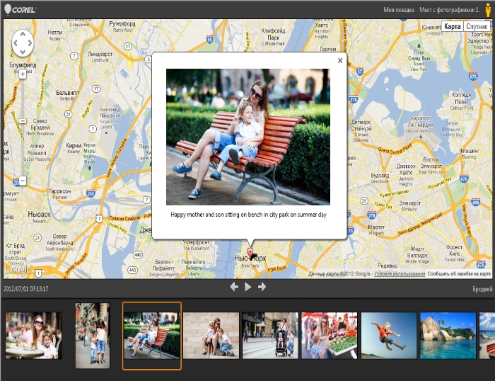 С помощью функции «Поделиться своей поездкой» можно создавать интерактивные слайд-шоу, в которых фотографии будут отображаться на карте в зависимости от их местоположения. Для просмотра фотографии в более крупном разрешении щелкните ее на карте.